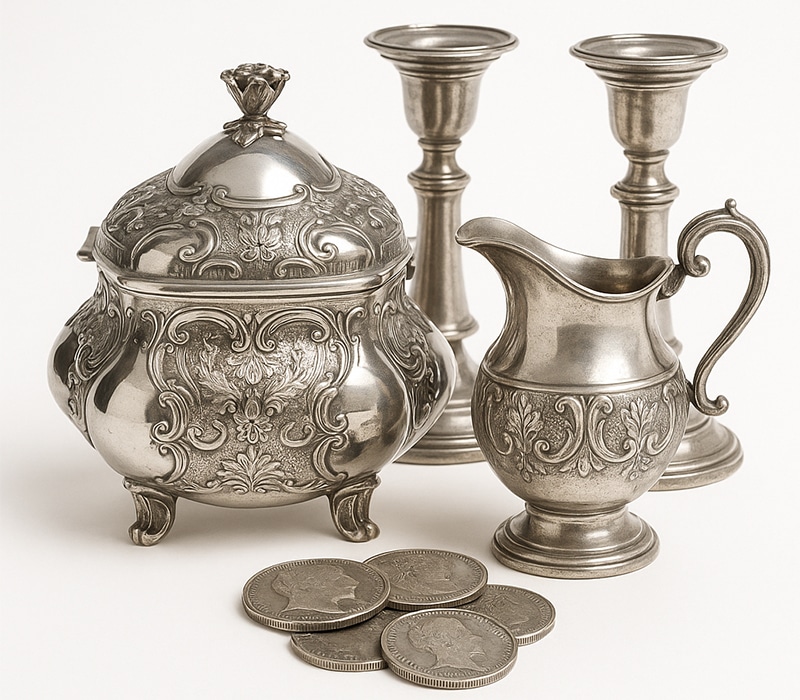 Silberankauf in Hamburg-Rahlstedt – Wir kaufen Tafelsilber, Silberbesteck, Silberschmuck, Silbermünzen und alle Arten von Silber. Faire Bewertung durch erfahrene Antiquitätenhändler seit 1986.