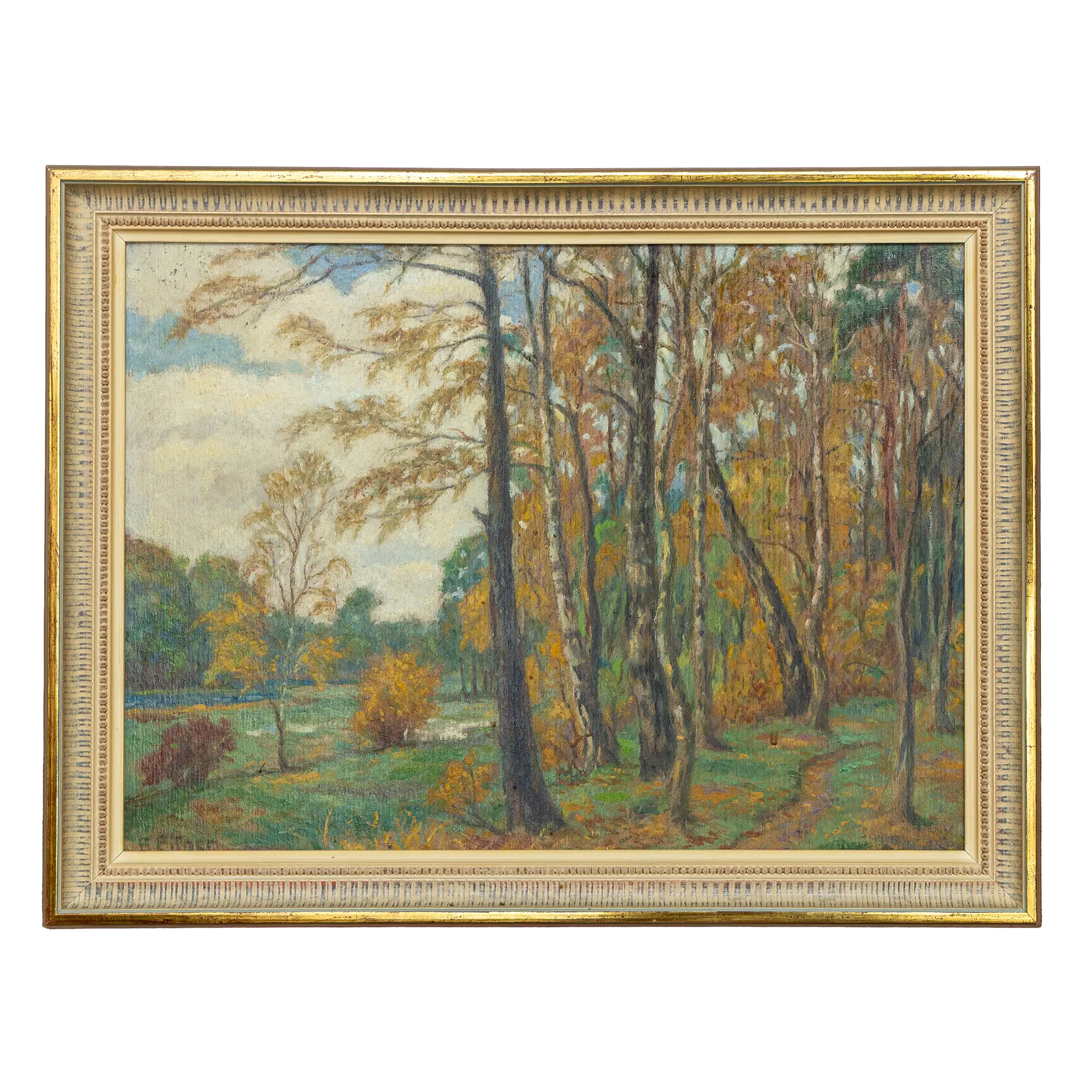Beschreibung: Dieses stimmungsvolle Werk des Hamburger Impressionisten Ernst Eitner fängt die herbstliche Atmosphäre im Hamburger Alstertal ein. Eitner, ein Mitbegründer des Hamburgischen Künstlerclubs von 1897, zeigt hier sein ganzes Können in der Freilichtmalerei. Die warme Farbigkeit der herbstlichen Bäume kontrastiert sanft mit dem kühlen Blau des bewölkten Himmels, während der für Eitner typische, lebendige Pinselstrich der Szenerie eine unmittelbare Präsenz verleiht. Ein klassisches Sammlerstück der norddeutschen Moderne.