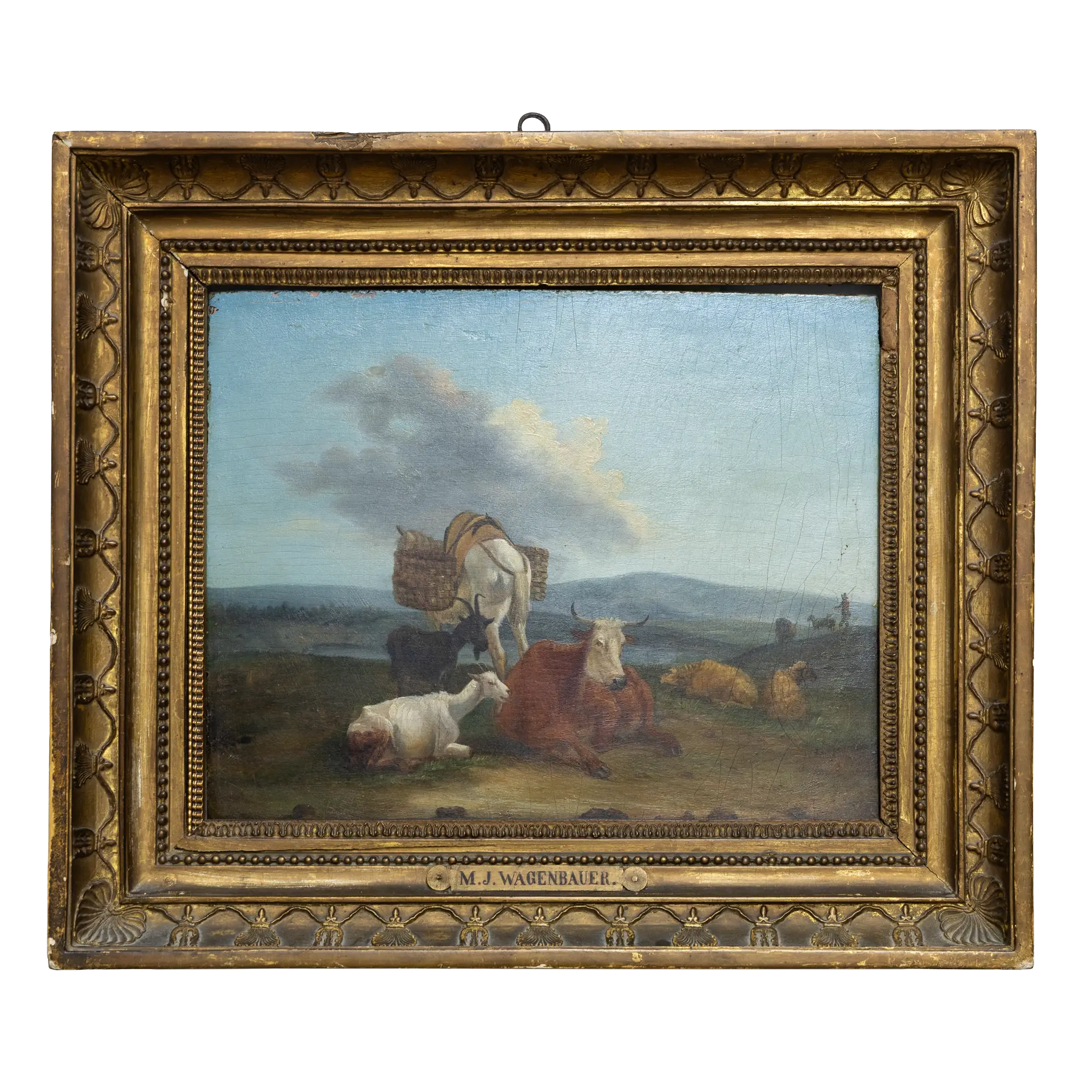 Das Werk zeigt eine für Wagenbauer typische, idyllische Szene: Eine Gruppe von Weidetieren – darunter eine ruhende Kuh, Ziegen und ein bepacktes Lasttier – rastet in einer weitläufigen, atmosphärischen Landschaft unter einem leicht bewölkten Himmel. Wagenbauer galt als Meister der Tiermalerei des frühen 19. Jahrhunderts und prägte den Übergang vom Klassizismus zum Biedermeier.