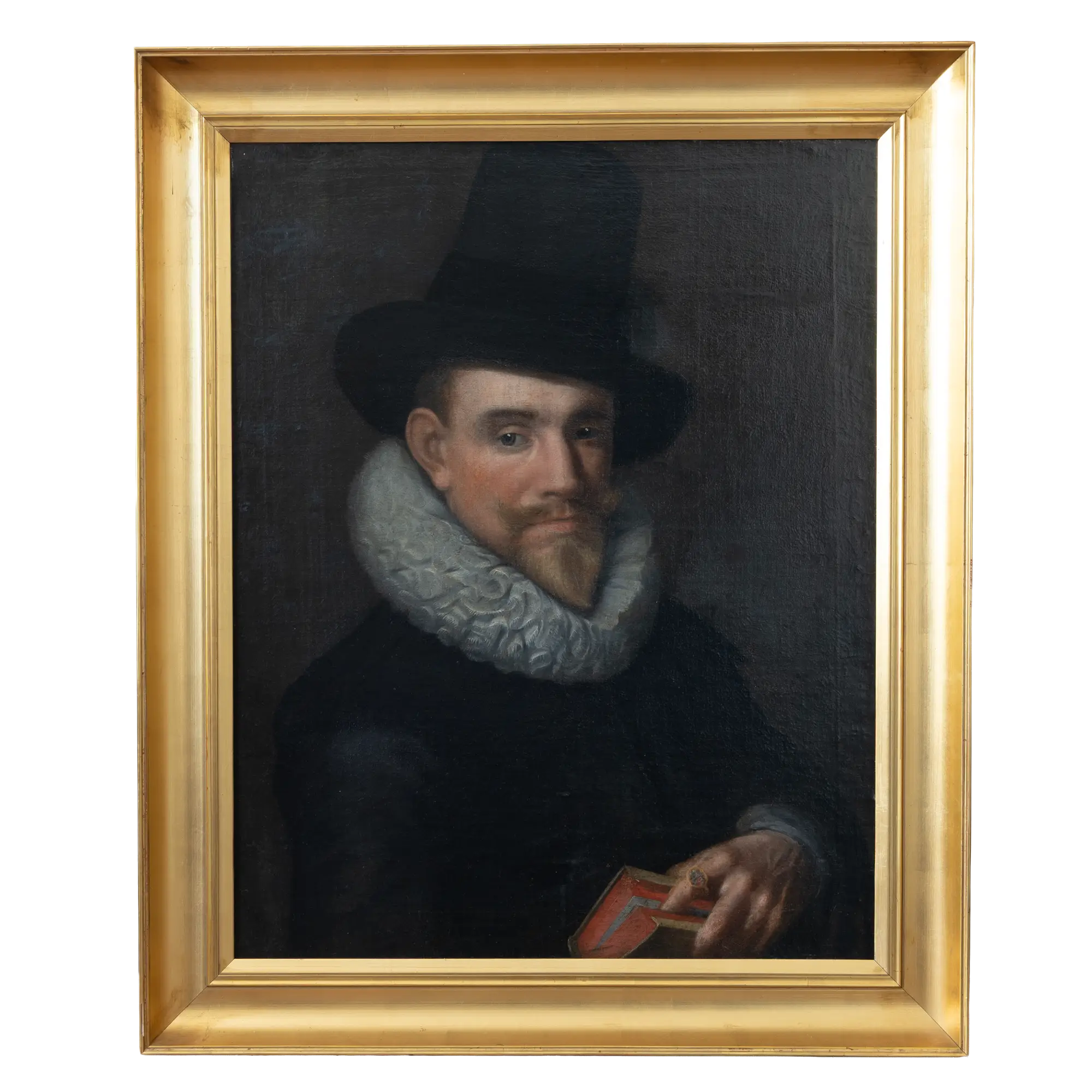 Zum Verkauf steht ein charakterstarkes Herrenbildnis, das in der Tradition der großen Porträtmalerei des 17. Jahrhunderts steht. Die Darstellung zeigt einen würdevollen Herrn in dunkler Tracht, akzentuiert durch eine aufwendig gemalte, weiße Pfeifenkrause und einen hohen Zylinderhut. In der rechten Hand hält der Dargestellte ein Buch mit rotem Schnitt, was ihn als Gelehrten oder Mann von Stand ausweist.